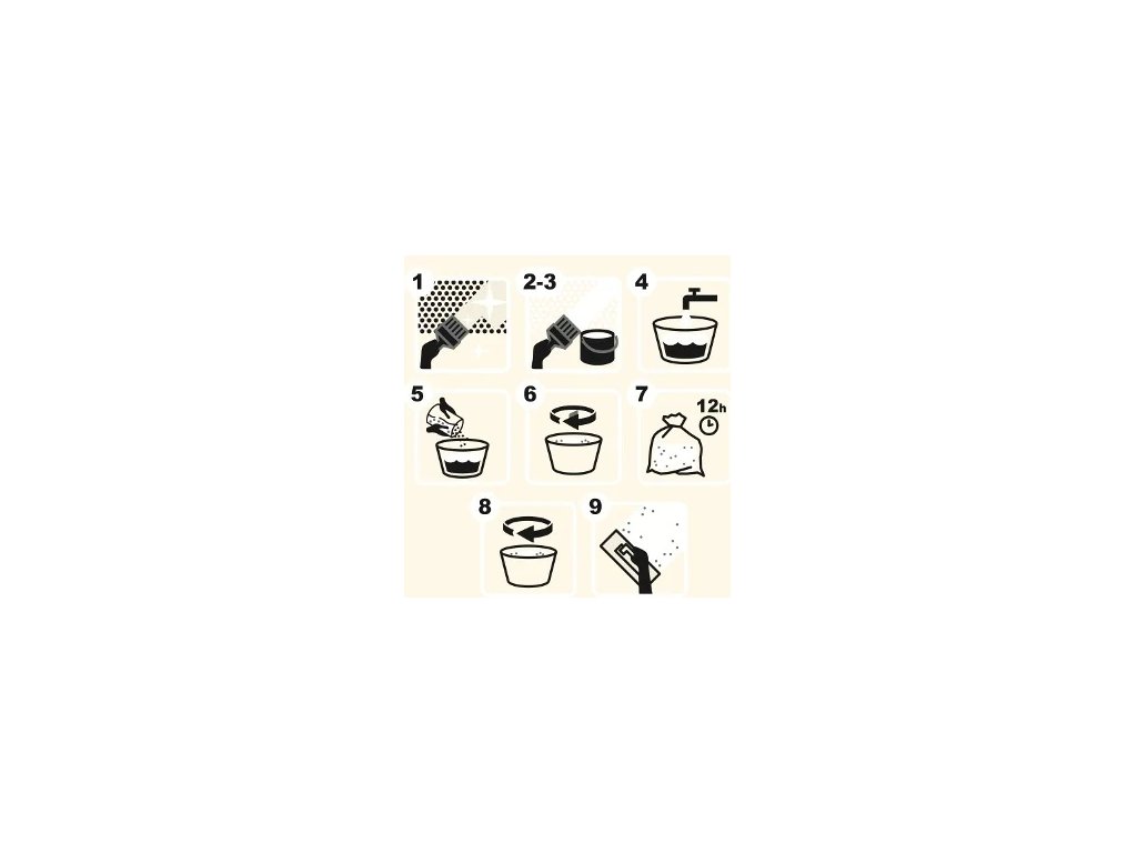 Důkladně ručně promíchejte materiál, aby se netvořily hrudky. Nikdy nemíchejte pouze jedno balení. Pokud používáte více balení, smíchejte je dohromady. Ujistěte se, že jedna stěna je celá pokryta materiálem ze stejné směsi.